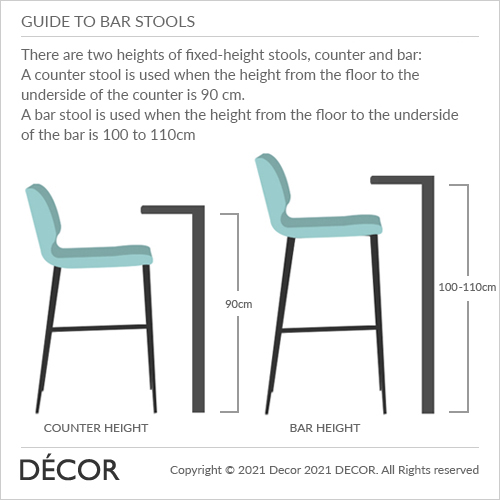 There are two heights of fixed-height stools, counter-height and bar-height. A counter-height stool is used when the height from the floor to the underside of the counter is 90cm. This is usually the height of a kitchen island or breakfast bar. A bar-height stool is used when the height from the floor to the underside of the counter is 100cm to 110cm. This usually the height of a bar or bar-height table
